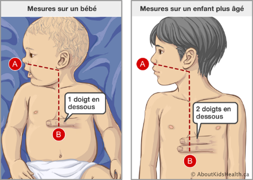 - Distance entre le nez/bouche et le lobe de l’oreille + distance entre l’oreille et le creux épigastrique (appendice xiphoïde) + Ajouter la distance nécessaire selon la taille de l’enfant pour placer la sonde en duodénal